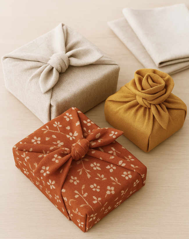 Furoshiki is a traditional Japanese wrapping cloth, but you can use any recyclable fabric, a scarf, or even new tea towels.