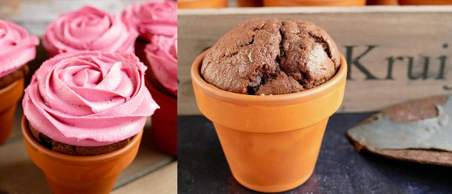 5. Top with chocolate icing or buttercream icing when cool. See how to create the buttercream rose toppings here. Serve in the terracotta pots.