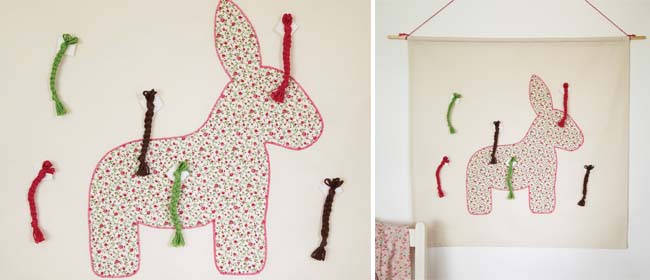 Use the donkey as a central appliqué for a baby’s blanket. Make it a playful spin on pin the tail on the donkey by sewing fabric tails in different places around the blanket.